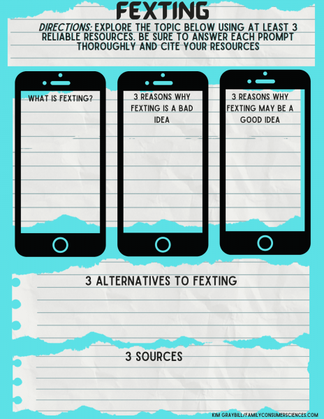 - Tell students they’re going to learn more about the term FEXTING and give them a graphic organizer to work through using a minimum of three reliable and current web-resources from the last two years. Encourage students to be thorough in their responses as they will need to use this information later.